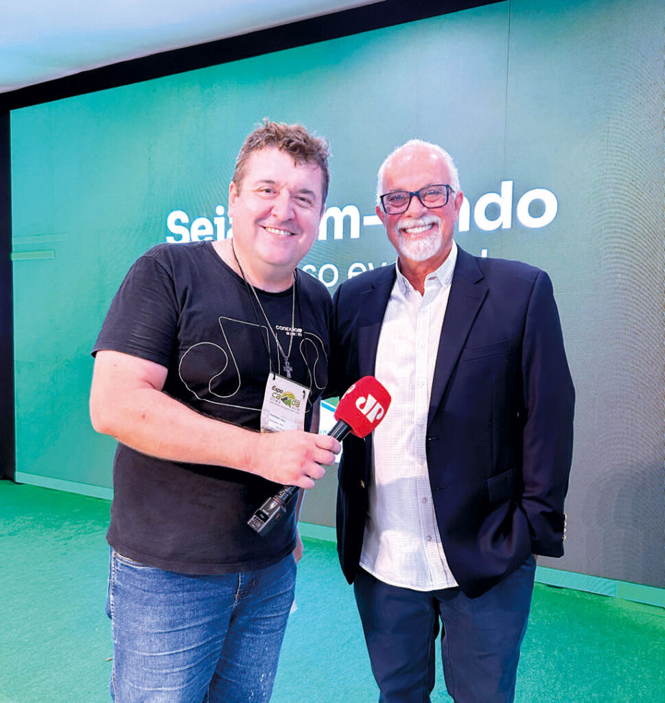 Alessandro Dassi, diretor e apresentador da Jovem Pan, durante a Expocamda 2026, na fazenda experimental em Adamantina, com o diretor-presidente da Camda, Waldomiro Teixeira de Carvalho Junior, que destacou a força do agronegócio e a inovação no campo. Conhecimento que movimenta o futuro!