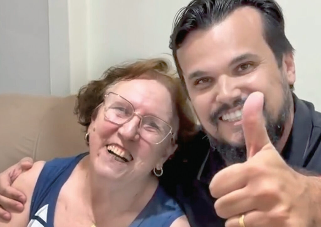 Maria Aparecida, emocionada, abraça o prefeito Renan Victor Pontelli ao saber que foi a primeira beneficiada do “Corujão de Exames”, que atenderá mais de 800 pacientes. Saúde, atenção e muita gratidão!
