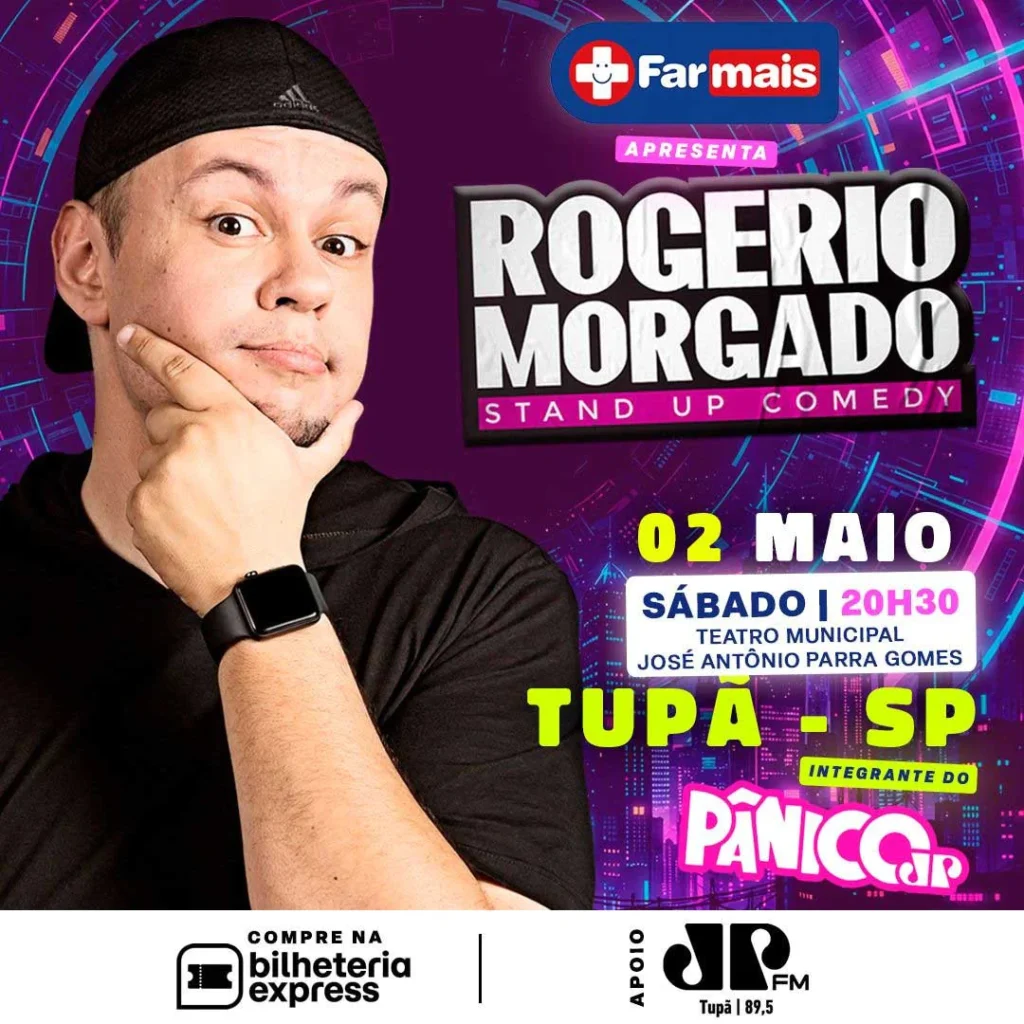 O comediante Rogério Morgado se apresenta em Tupã no dia 2 de maio, às 20h30, no Teatro Municipal José Antônio Parra Gomes. O espetáculo traz ao palco situações do cotidiano com piadas e momentos de improviso.